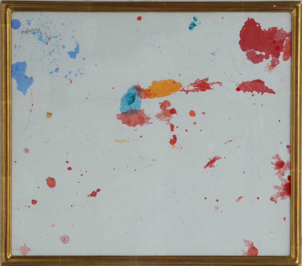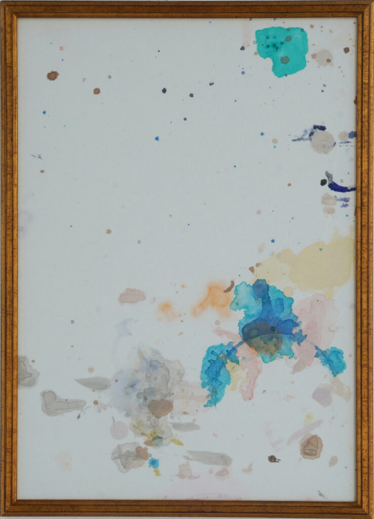 Die Flecken entstehen als zufallsbasierte Nebenprodukte von Arbeitsprozessen. In weiteren Arbeitsschritten werden Bildauschnitte bestimmt, Buchstaben mit Schreibmaschine eingetippt, die Ingrespapiere gepresst, aufkaschiert und gerahmt.